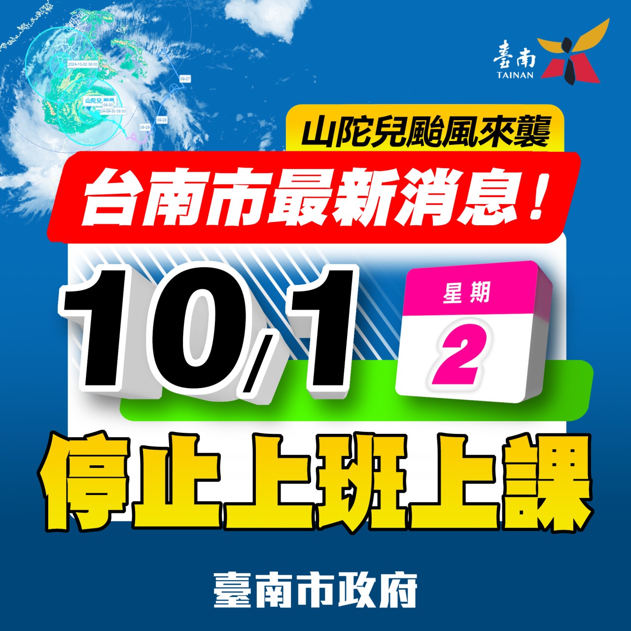 因山陀兒颱風來襲,臺南市政府宣布10/01(二)全天停止上班、上課,本局永華文化中心管理科轄下臺南文化中心、歸仁文化中心、台江文化中心及新化演藝廳各場館暫停開放。