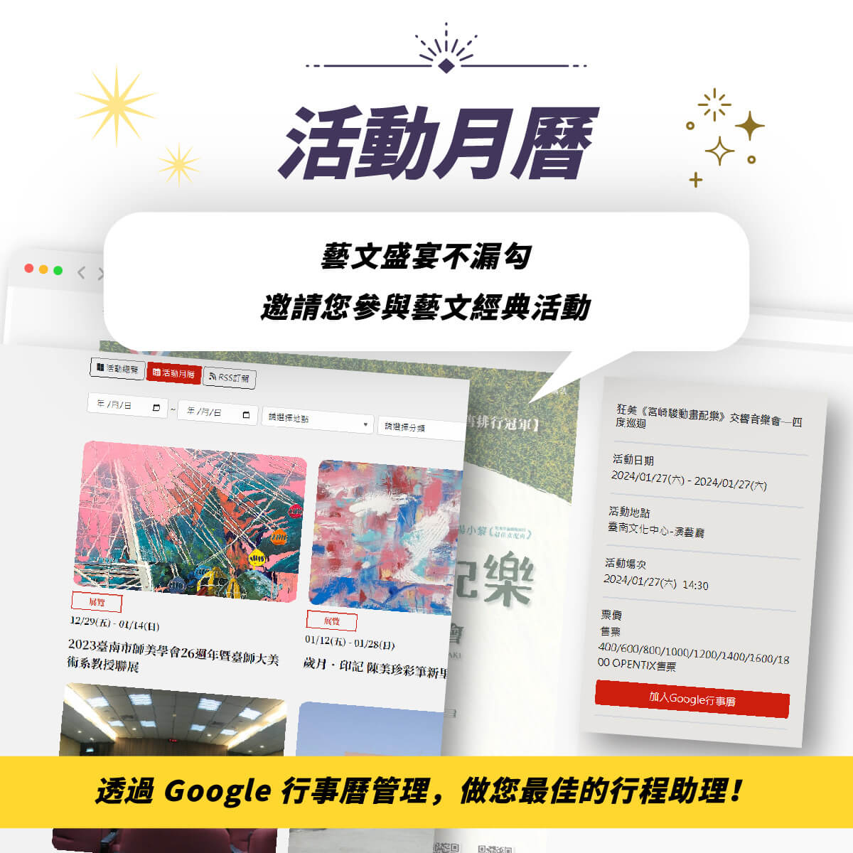 活動月曆除了卡片式亮點設計,也提供貼心的活動日期總覽切換,民眾可依據瀏覽習慣選擇,並提供將活動加入Google個人行事曆功能,輕鬆安排你的藝文生活。