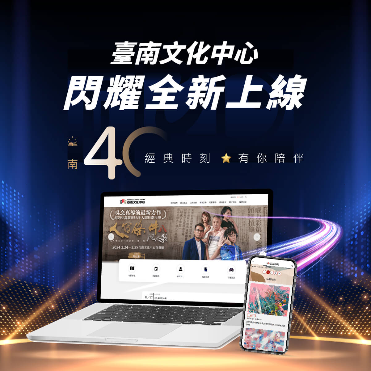 臺南文化中心於各界藝文愛好者的矚目下,推出網站全新改版上線,以更加便捷的功能服務、更友善的瀏覽介面,更快速的藝文查詢與互動,用現代美學數位設計方法,帶出科技應用之於藝文場域轉換的薰陶,創造嶄新網站體驗,同時臺南文化中心40年里程碑,經典時刻、嶄新樣貌、與你共享!