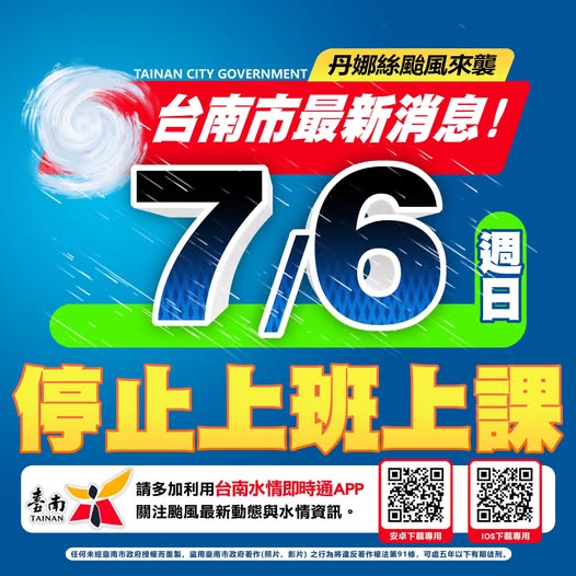【颱風停班課活動異動公告】因颱風來襲臺南市7/6全天停止上班課,本局轄下各場館暫停開放。相關活動異動資訊。