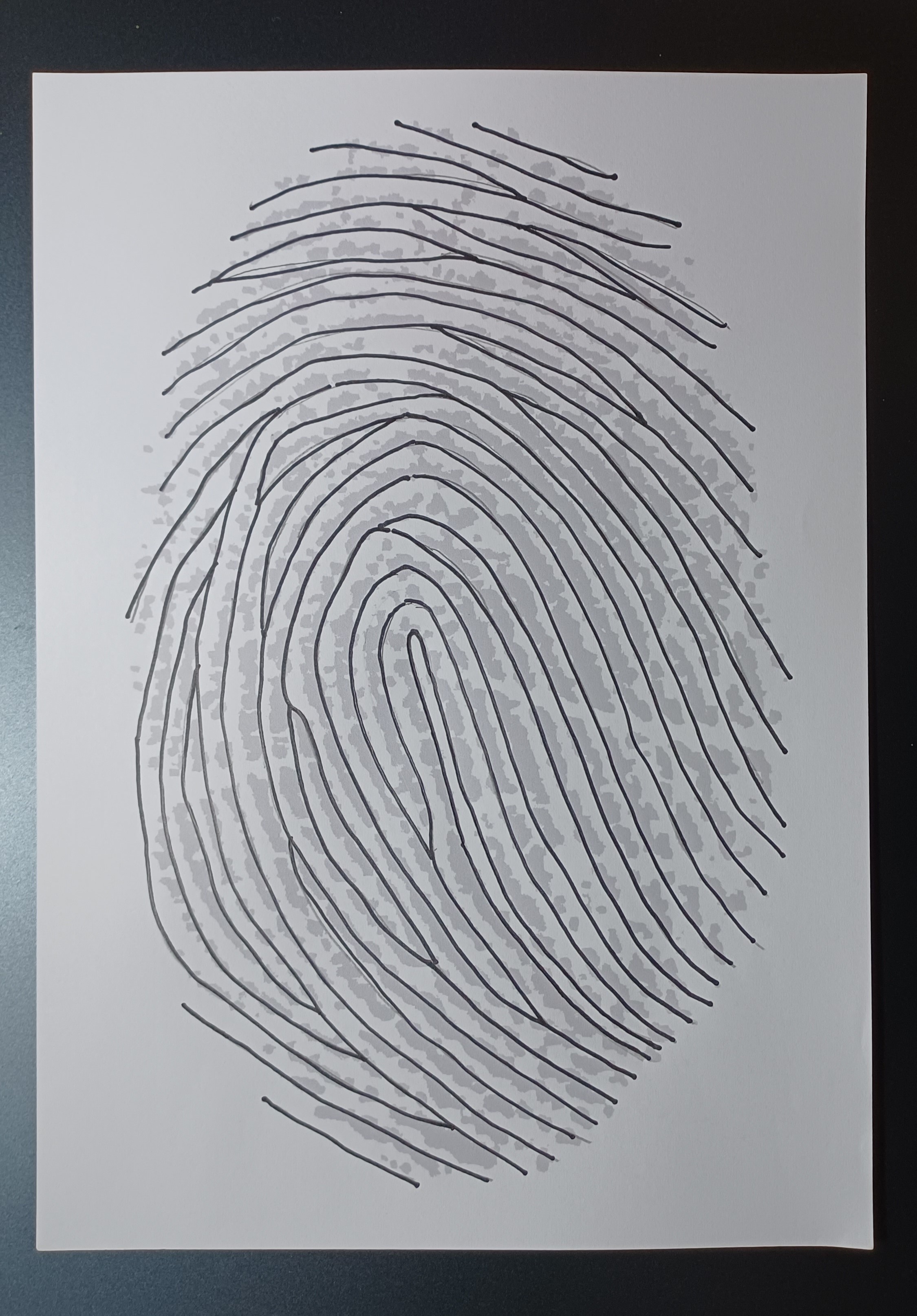 將參與者的指紋放大簡化成圖稿,再用自己的手指沾著顏料碰觸,最後將大指紋壓印為完整的圖案。