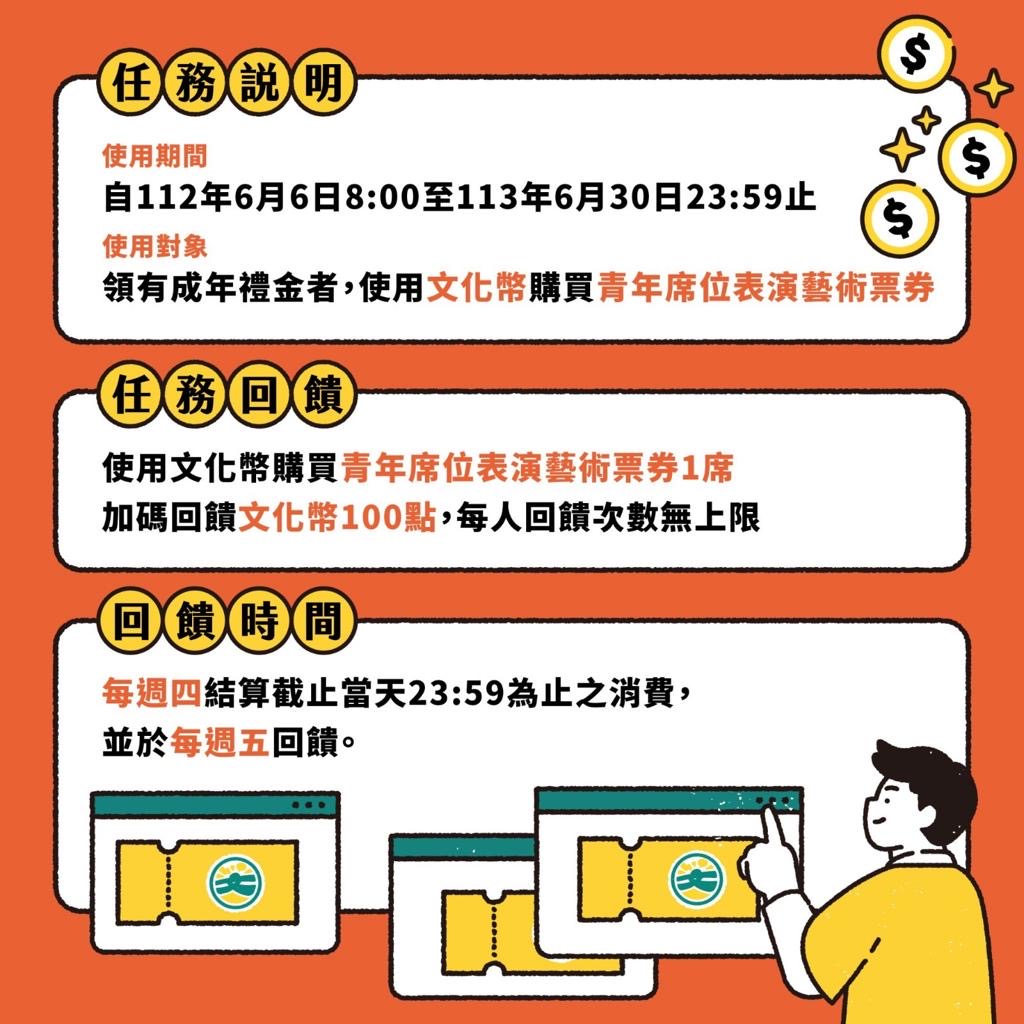 文化部新聞:文化成年禮金購買青年席位加碼贈100點文化幣 開啟進劇場的第一次。(https://www.moc.gov.tw/information_250_154530.html)