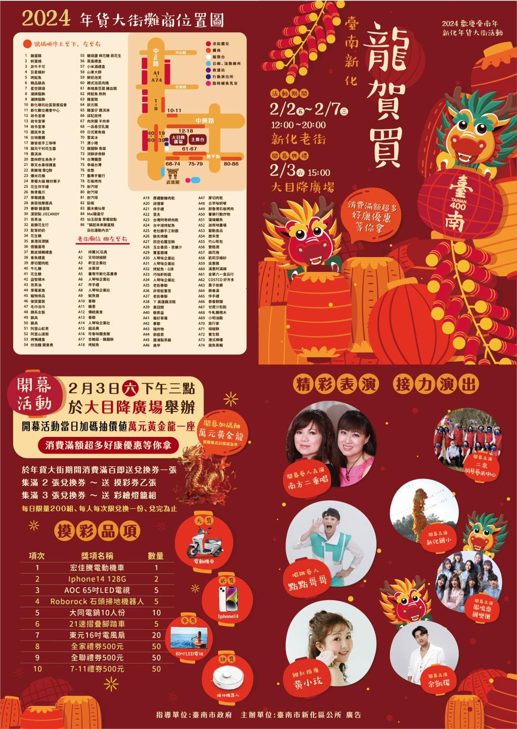 2024新化年貨大街取名為「龍賀買」,以好逛、好買、好康為活動主軸,期待大家來新化辦年貨。